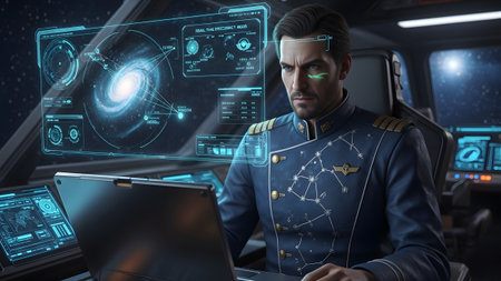 A man in a dark blue uniform with gold trim sits in a spaceship cockpit, interacting with a...