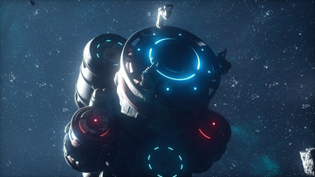 Space background. Two spaceship fly in colorful nebula and planet. 3D rendering