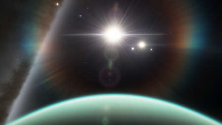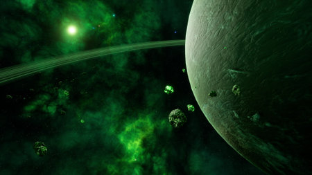 science fiction wallpaper, cosmic landscape, realistic exoplanet, beautiful alien planet in far space, detailed planet surface 3d render