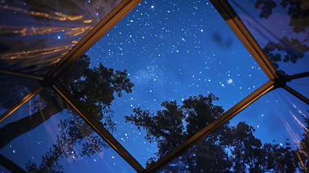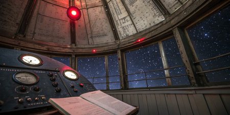An observatory interior shows a control panel with gauges and a book open, while a stunning night sky filled with stars glows outside the windows, creating a peaceful atmosphere.