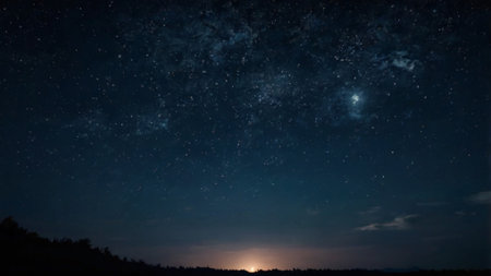 A breathtaking view of a starry night sky filled with twinkling stars and shimmering cosmic dust against a rich dark blue background, evoking calmness.