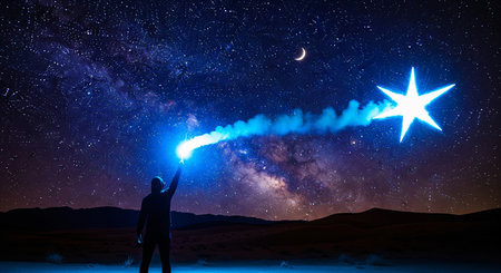 Guiding Light in the Desert Night: Man Reaching for a Radiant Star Under the Milky Way