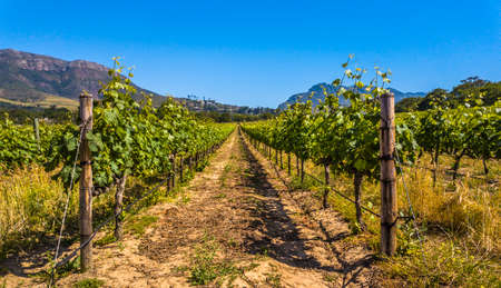 Neat and tidy rows of young grapevines in the warm South African sun near Franschhoek