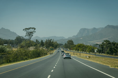 Picturesque motorway or road from cape town to stellenbosch, with mountains visible in the background. Hazy afternoon in south africa on the road