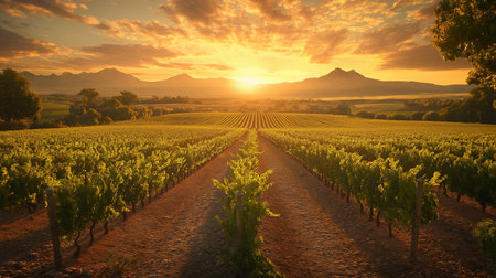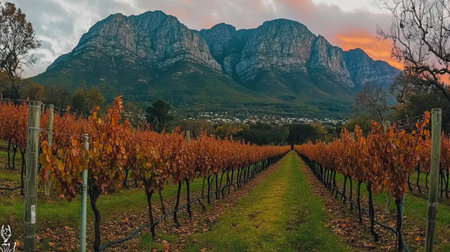 A South African winemaker inspecting a row of ripe grapevines in a sprawling vineyard at sunset, with the distant Table Mountain towering in the background --chaos 12 --ar 16:9 --weird 150 --v 6.1 Job ID: 8b2832e5-27d5-4871-8fb5-62655f038553