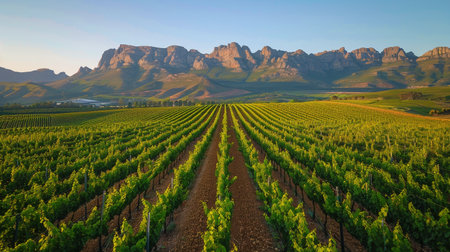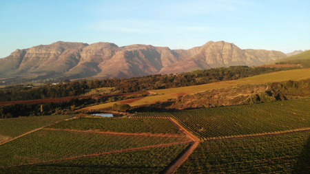 Wine farm. Vineyard landscape at sunset with mountains. Stellenbosch, South Africa. vine grapes rows.