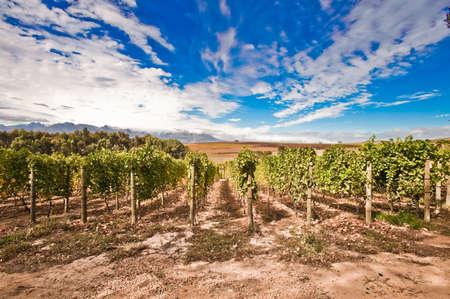 Vineyard on Pleisir de Merle wine farm in autumn. Shot in the early afternoon with blue sky and fluffy clouds covering the mountain, in South Africa.