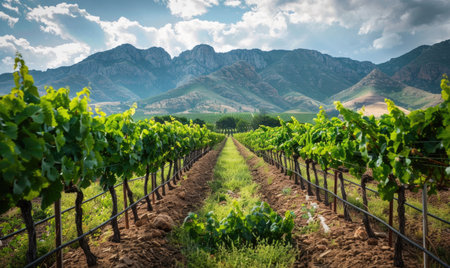 Vineyard with lush green grapevines and a mountain backdrop