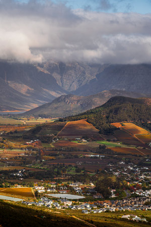 Landscape of the famous Franschhoek Valley wine region in the Western Cape of Southern Africa as seen from the top of the surrounding mountains