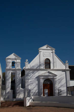 Horizontal photo of the Dutch Reformed Church in Franschhoek in Winelands in Western Cape, South Africa, on a sunny February day. Blue sky and mountains in the background. Wide angle.