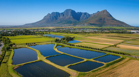 Mountains stand over peaceful rural setting, offering sense of seclusion from bustling city life. Tranquil countryside scene, greenery, agricultural fields, serene pond. Picturesque location, aerial