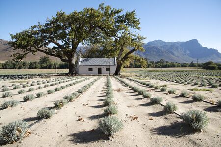 FRANSCHHOEK WESTERN CAPE SOUTH AFRICA - APRIL 2016 - A lavender farm in the Franschhoek Valley with a backdrop of the Simonsberg mountain