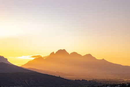 South Africa, mountains silhouettes in sunset light, banner. Golden hour, natural landscape with tonal perspective