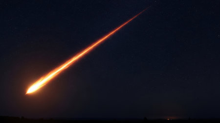 This image captures a breathtaking moment of a bright meteor streaking across the night sky. The meteor, with its fiery trail, contrasts sharply against the dark backdrop of the heavens. The scene is serene yet dynamic, highlighting the beauty and transience of celestial events.