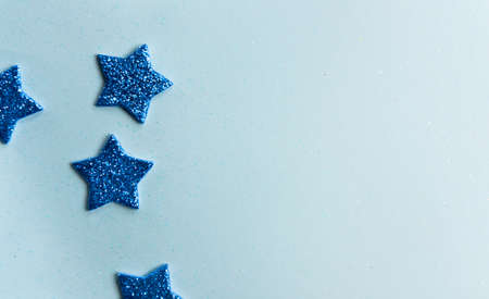 A close up view of shiny silver star confetti scattered across a smooth pastel blue surface. Festive holiday background with sparkling glitter and copy space.
