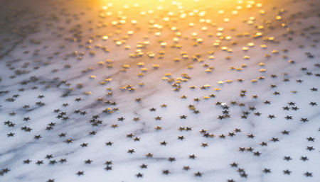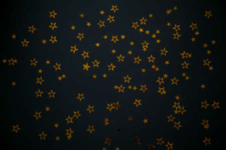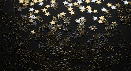 A scattering of golden star-shaped confetti creates a festive and celebratory atmosphere against a dark background, perfect for holiday themes.