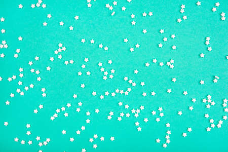 Little white stars on mint background. Holiday concept. Flat lay, top view.