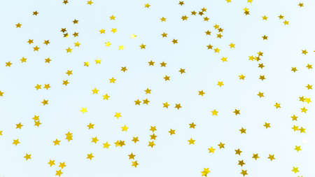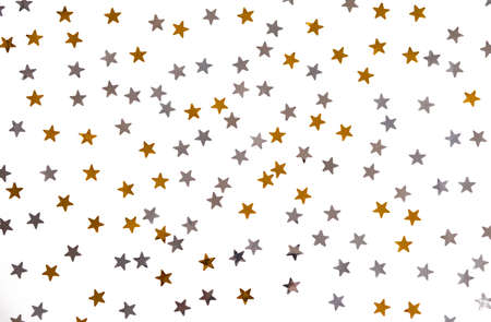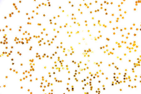 Festive backgound with many golden yellow small shiny stars on white backgound. Photo with copy blank space.