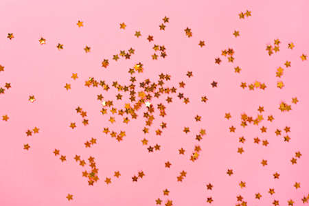Delicate pink background with golden glitter stars. Flat lay. Holiday concept. New year time. Banner