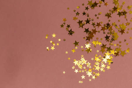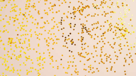 Golden stars in the form of confetti on beige background top view.