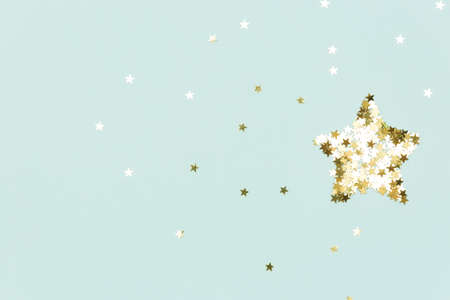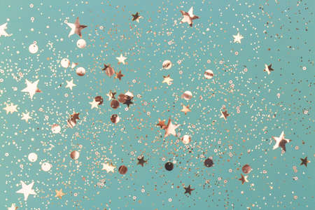 Confetti on blue background. Christmas concept. Flat lay, top view