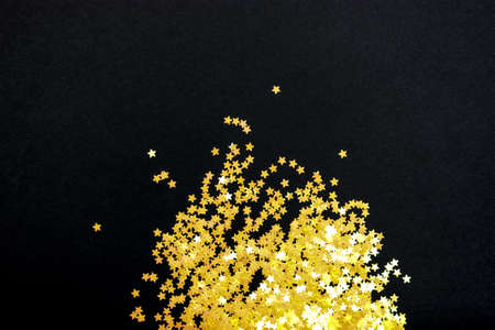 A scattering of golden star confetti creates a festive and celebratory atmosphere against a dark, elegant black background. Perfect for holiday themes.