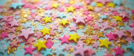 A vibrant assortment of star shaped sprinkles in various colors creates a cheerful and whimsical backdrop, perfect for decorating desserts during parties or special occasions.