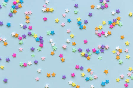 blue background with multicolored stars confetti, selective focus