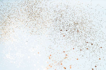Golden shiny stars glitter or confetti on gray background