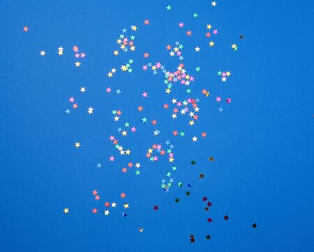 multicolored shiny confetti in the form of stars on a blue background, festive backdrop template. Bright festive decor