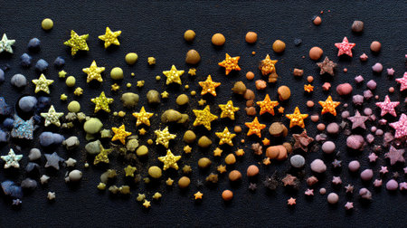 A stunning display of colorful glitter stars and round dots arranged on a dark background, perfect for artistic designs and creative projects.