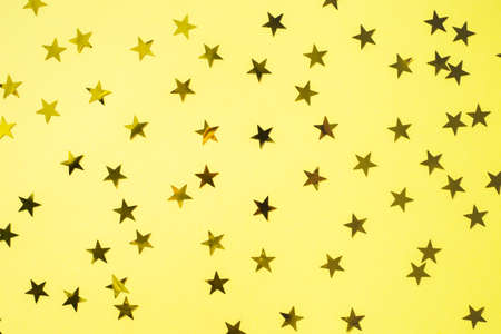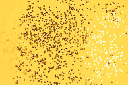 Golden confetti in the form of stars on yellow background. Festive day backdrop. Flat lay style with minimalistic design. Template for banner or party invitation
