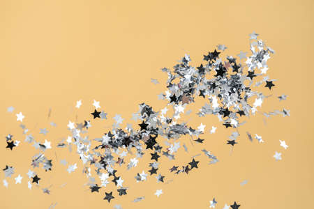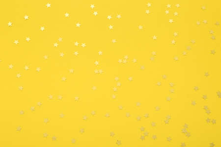Background of shiny silver little stars on yellow background. Christmas concept. Glitter texture.