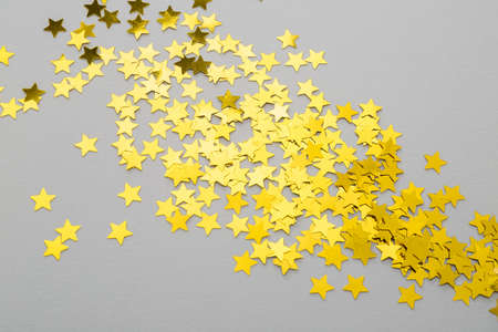Golden confetti in shape of stars on gray background, closeup