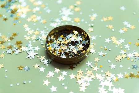 golden confetti in tin jar on green background