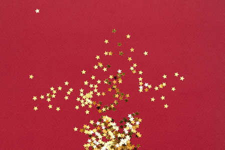 Red background with golden star glitter. Top view flat lay. Christmas background