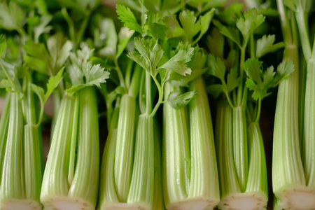 Fresh celery stalks with lush leaves and water droplets