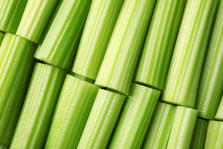 Fresh green cut celery as background, top view