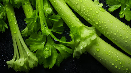 fresh celery with sparkling raindrops, captured from an overhead angle using a hasselblad camera. this award-winning photograph showcases the vibrant colors and textures of the celery, enhanced by soft lighting and high-end retouching. perfect for advertising or commercial purposes, this high-resolution, top-view image is a fine art masterpiece with stunning detail. ai generated