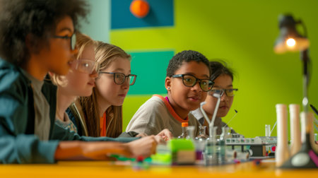 Focused children conducting science experiments with lab equipment. Educational and science concept.