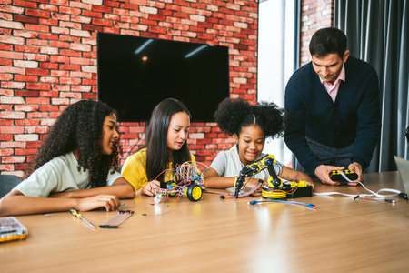 Teacher working together with kids on project with electric toys and robots at robotics classroom, helping them