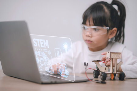 Asia students learn at home in coding robot cars and electronic board cables in STEM, STEAM, mathematics engineering science technology computer code in robotics for kids concept.