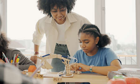 Unrecognizable female teacher helping girl students to assemble pieces of machine in a robotics class. Elementary technological education concept.