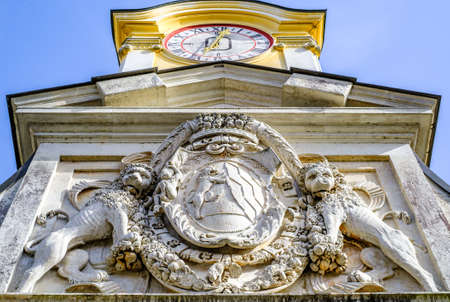 closeup city of Lvov armorial bearings sculpture on white stone