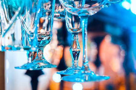 Empty cocktail and wine glasses on bar interior background. Artificial lighting creates reflections and glares in glass. Selective focus in center of image.