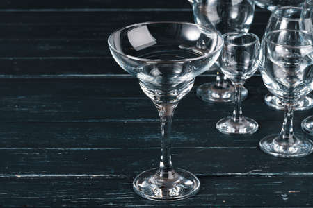 Many empty wine glasses on a table. Dishes in the restaurant for the reception of guests and an alcoholic party.