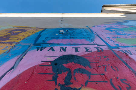 Paris, France - May 17, 2020: Low angle view of a graffiti saying 'wanted', taken at the end of the day, Butte-aux-Cailles