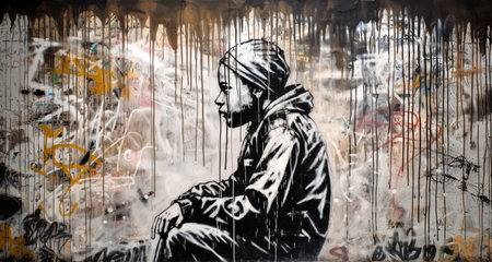 Generative AI, Ink black street graffiti art on a textured paper vintage background, inspired by Banksy.