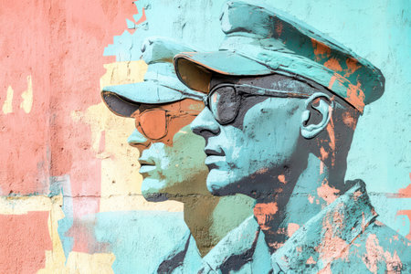 The mural displays two stylized soldiers wearing sunglasses, set against a vibrant, artistic background. The colorful design adds an expressive element to the military theme.