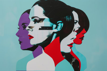 Abstract artwork featuring a woman with multiple faces in vibrant colors
